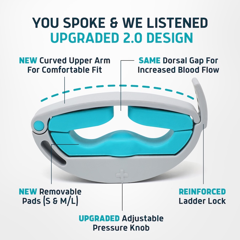 Redesigned curved upper arm for improved comfort, an upgraded pressure knob, removable bottom pads (S & M/L) for a more precise fit, and a reinforced ladder lock for added security and durability—plus the same proven dorsal gap to support healthy blood flow.